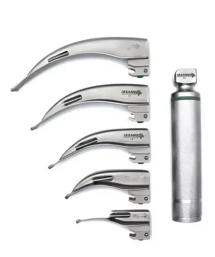 Laringoscopio Macintosh con 4 hojas y luz LED, estuche resistente para almacenamiento seguro. Ideal para intubación y manejo de la vía aérea.