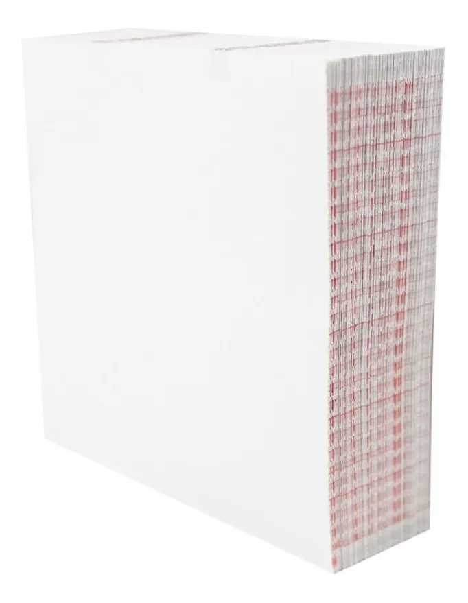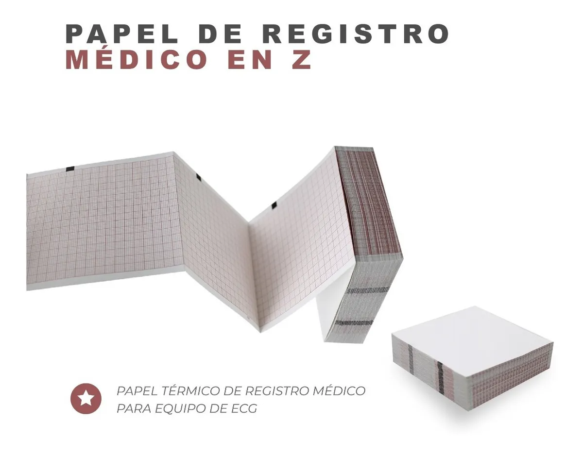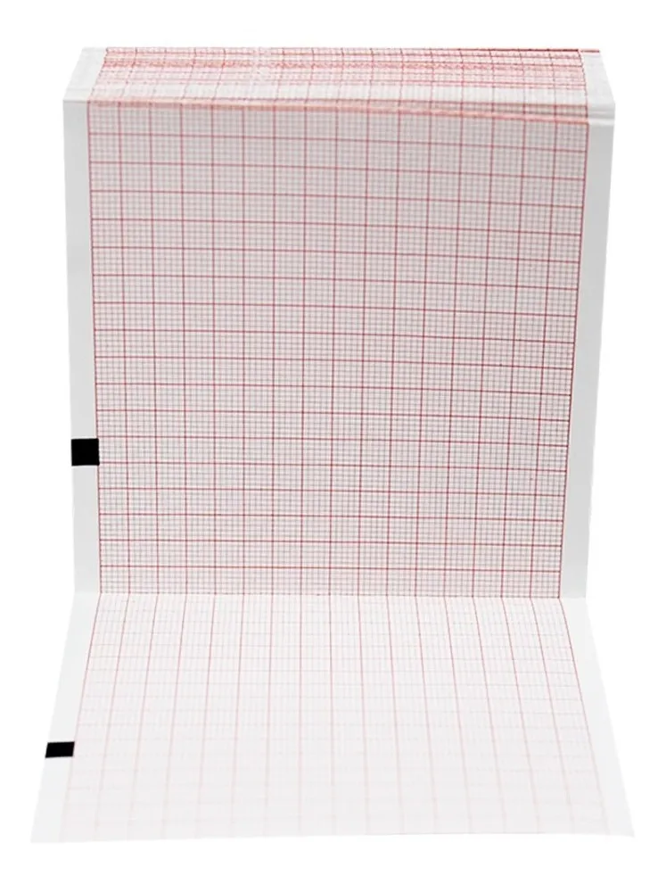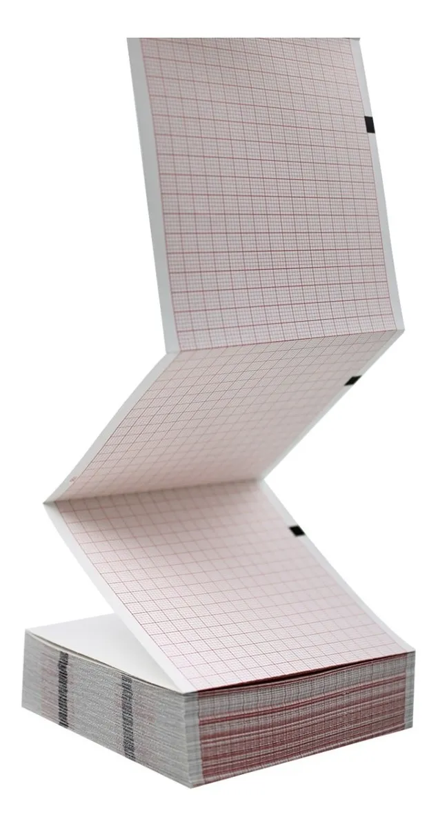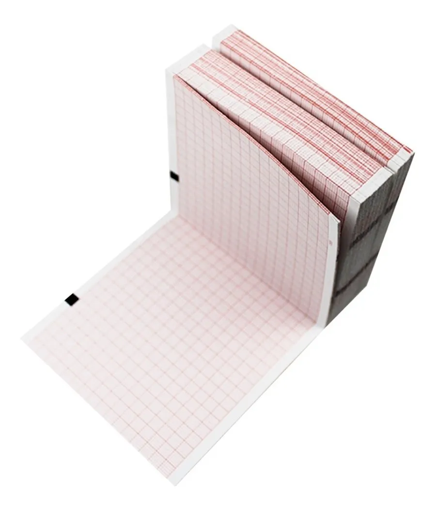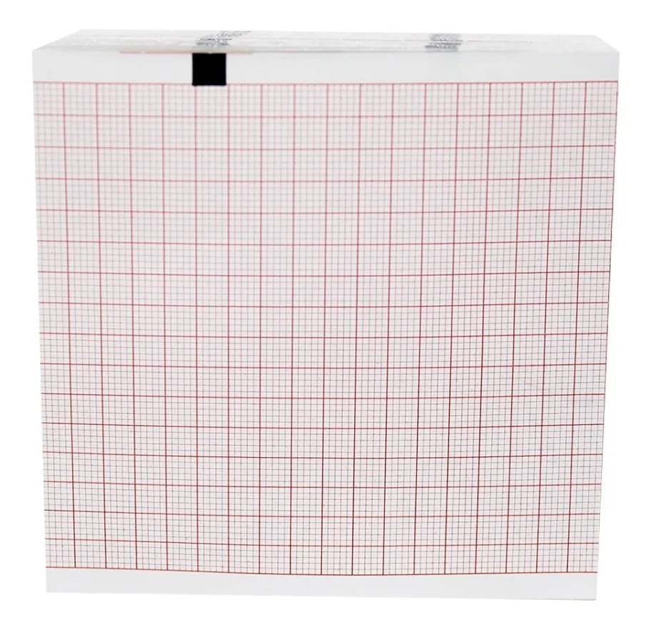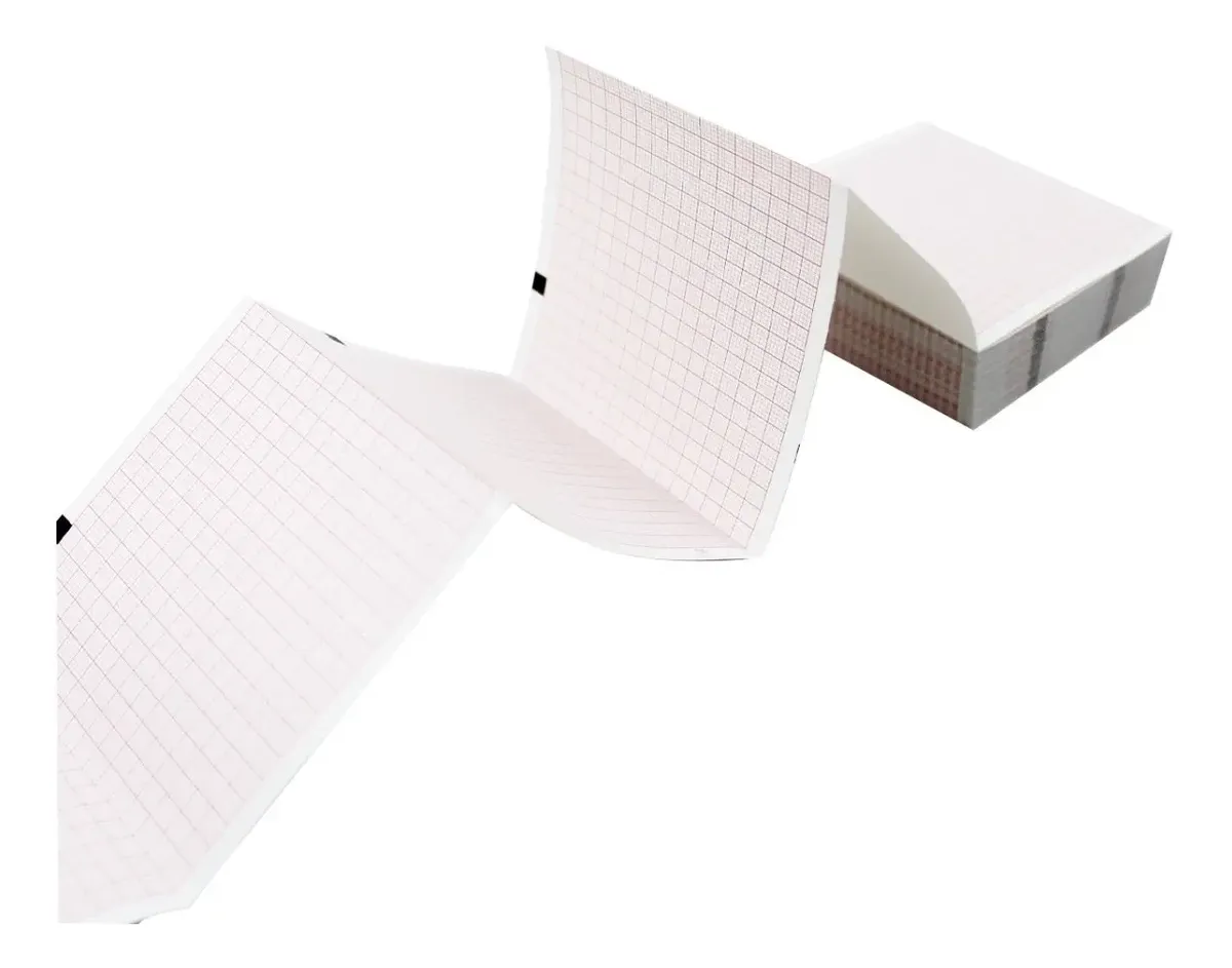 Papel ECG térmico Z/Fold 90 x 90 mm con 295 hojas, de alta sensibilidad y cuadrícula milimétrica en rojo. Ideal para electrocardiógrafos compatibles.